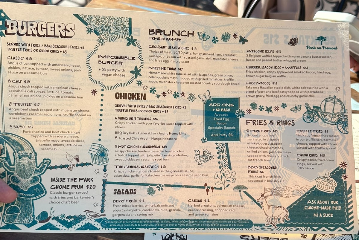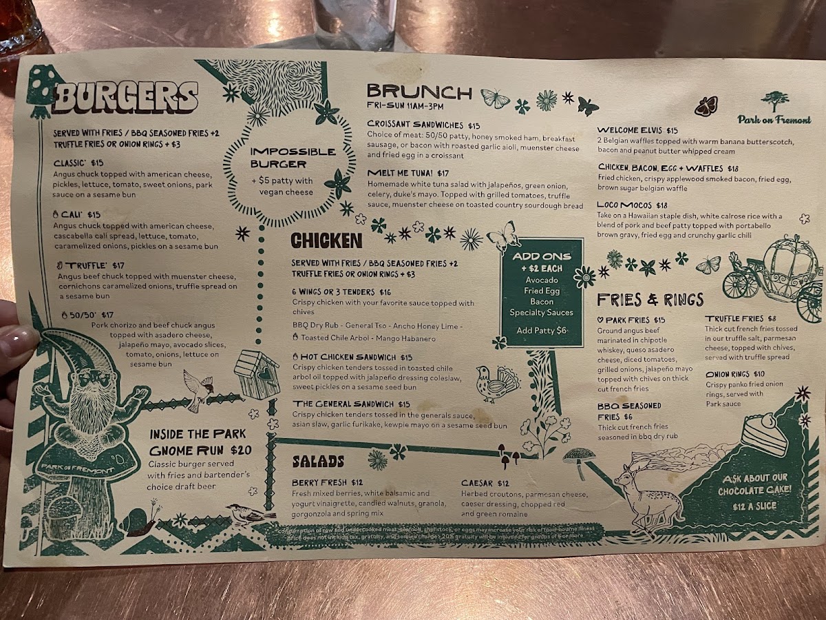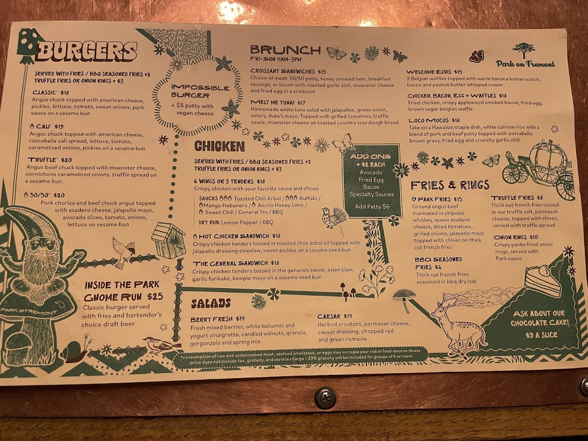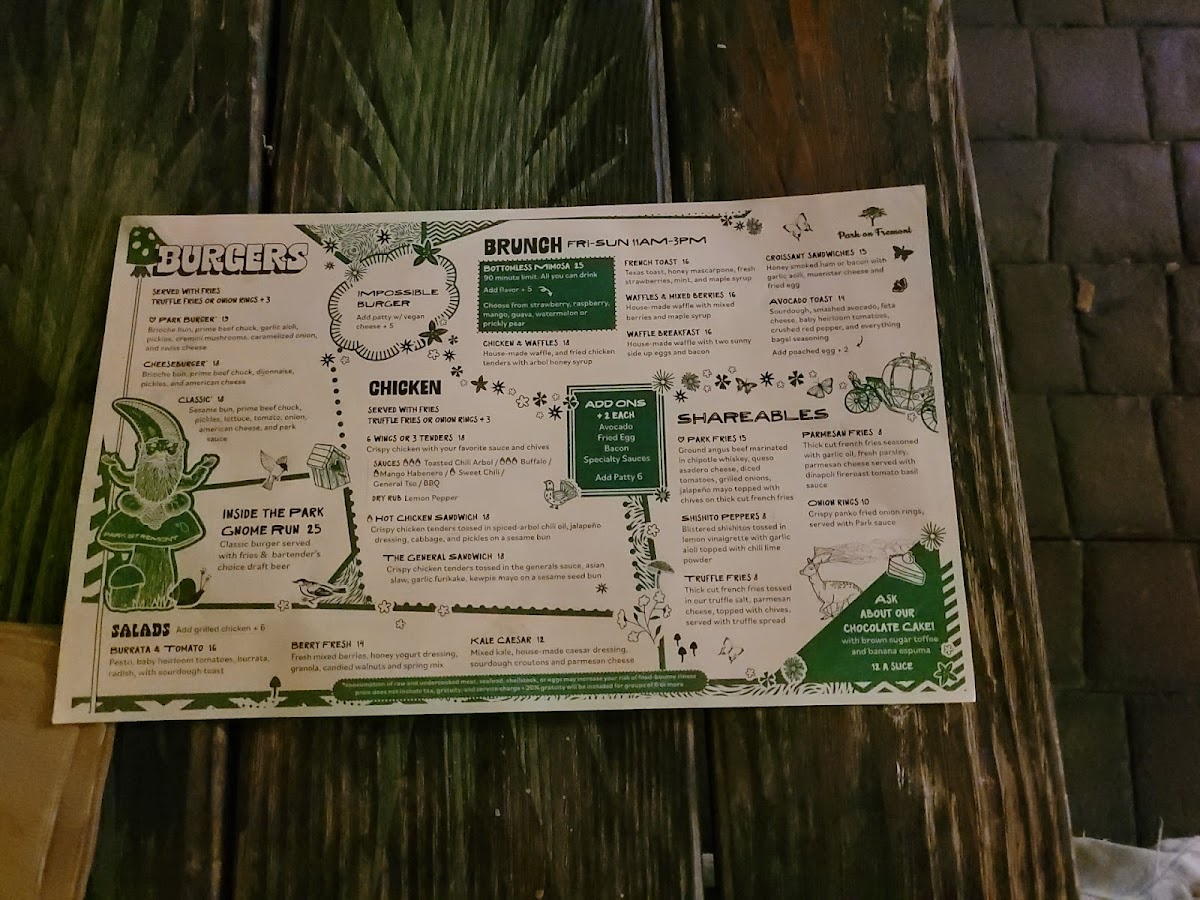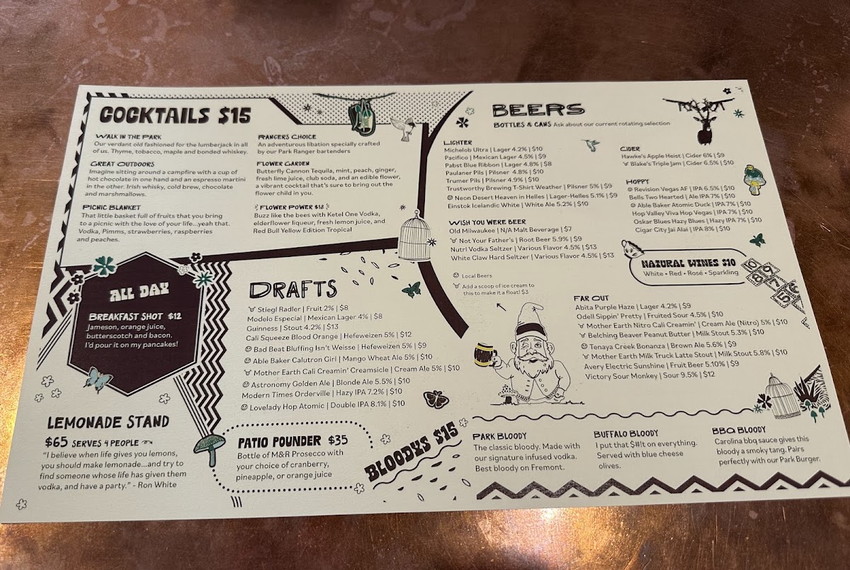 As for beverages, the cocktails are an experience unto themselves. The Walk In The Park, a smooth old fashioned with hints of thyme and maple, delights at $16.00. Meanwhile, the Great Outdoors, featuring a whimsical campfire mix of Irish whiskey and cold brew, is perfect for those wanting to savor a nostalgic flavor.